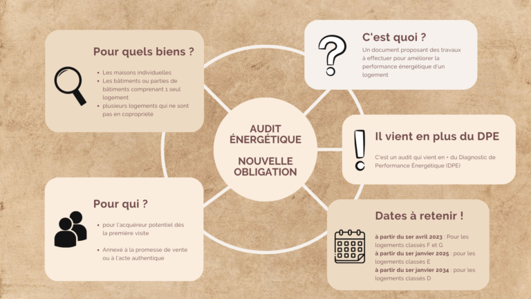 L’audit énergétique est à fournir avant toute visite et toute signature de promesse de vente d’un bien hors copropriété depuis le 1ER Avril 2023, pour :